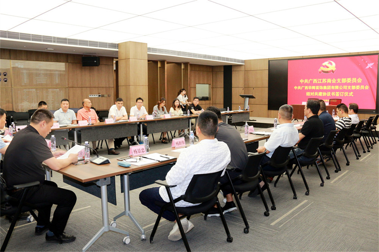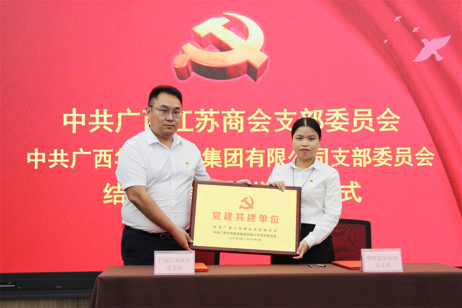 簽約儀式上,商會(huì)黨支部書記王偉、華輝裝飾集團(tuán)黨支部書記劉萍東簽訂了結(jié)對(duì)共建協(xié)議,并由王偉同志代表廣西江蘇商會(huì)黨支部向廣西華輝裝飾集團(tuán)有限公司黨支部贈(zèng)牌。