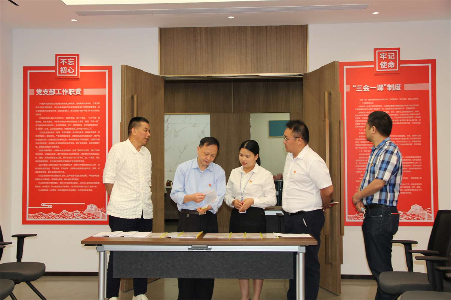 ▲李開剛(左二)查看華輝黨支部黨建工作臺(tái)賬