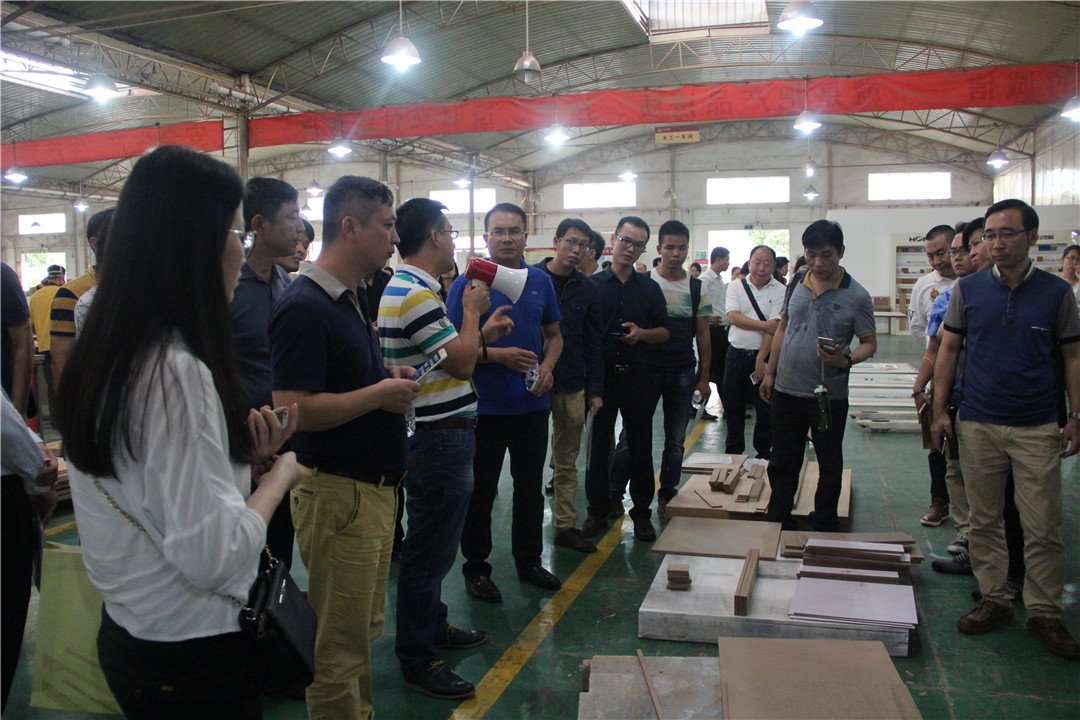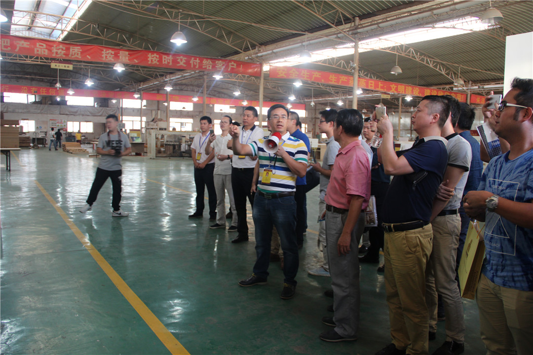 隨后,覃祖榮副總經(jīng)理帶領(lǐng)與會(huì)人員參觀了華輝集團(tuán)的固裝家具產(chǎn)品展示,介紹了相關(guān)產(chǎn)品,并帶領(lǐng)大家到集團(tuán)公司的生產(chǎn)車間現(xiàn)場(chǎng),參觀工廠的流水線生產(chǎn)情況,了解更多的工廠管理模式及產(chǎn)品質(zhì)量控制等。