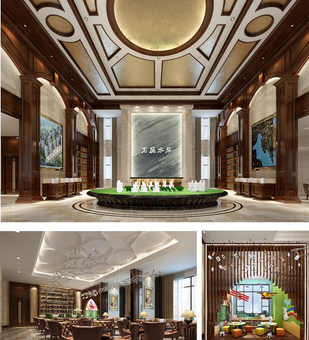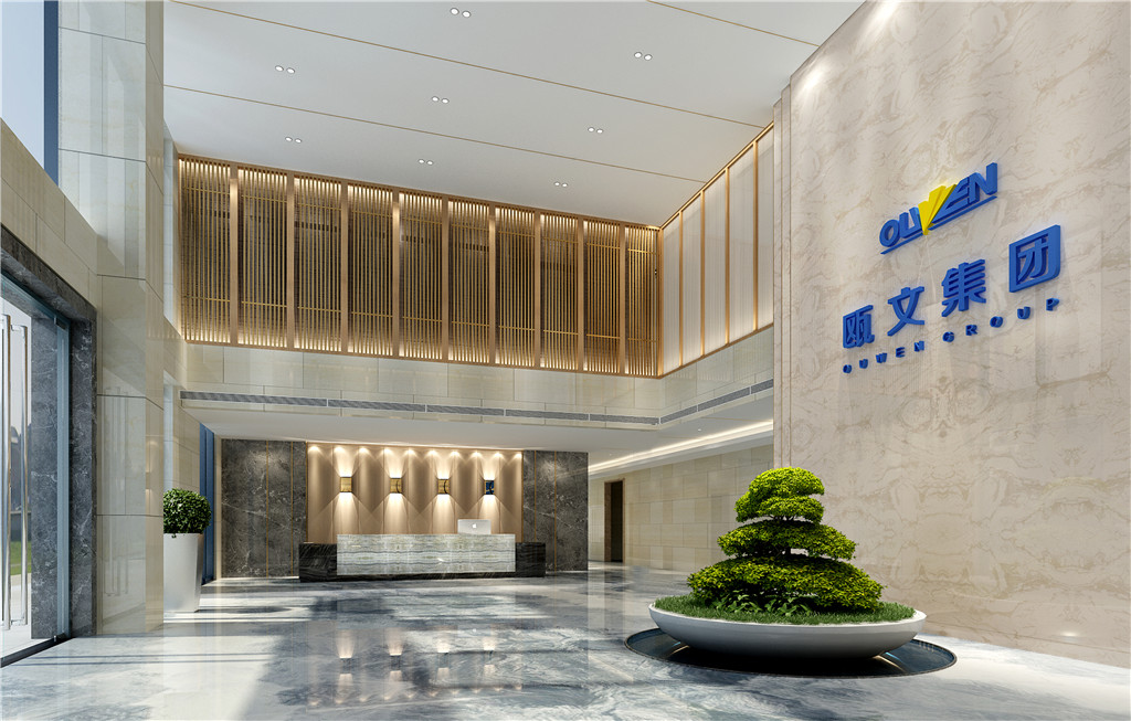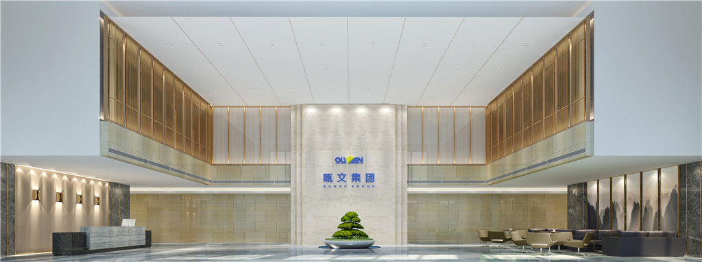 取水之藍、家之皇為元素,以木飾面、陶瓷、大理石為載體,應(yīng)用于墻面、地面、主背景墻。體現(xiàn)了歐文集團厚德載物,開放包容,儒雅熱情迎八方來客的氣魄。