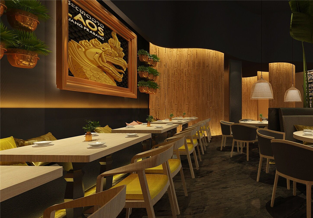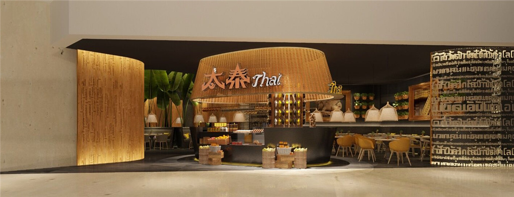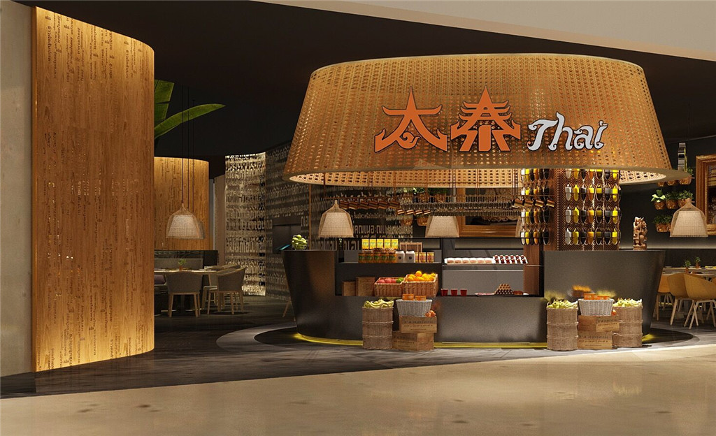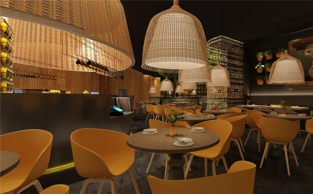本項(xiàng)目融入大量的泰國元素:手工竹藝編織的收銀臺(tái)頂超大燈罩及小吊燈燈罩、木藝雕刻、芭蕉樹、裝飾畫、綠植等,演繹原汁原味的泰國風(fēng)情。色澤上大多采用原木色調(diào)及泥土褐色,散發(fā)著濃烈的自然氣息,搭配明艷的黃色,自然溫馨中不失歡躍之感。自然、熱情、獨(dú)特,這是大景傾情打造的地道真實(shí)的泰國味道。
