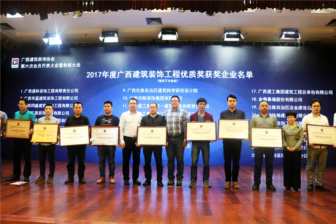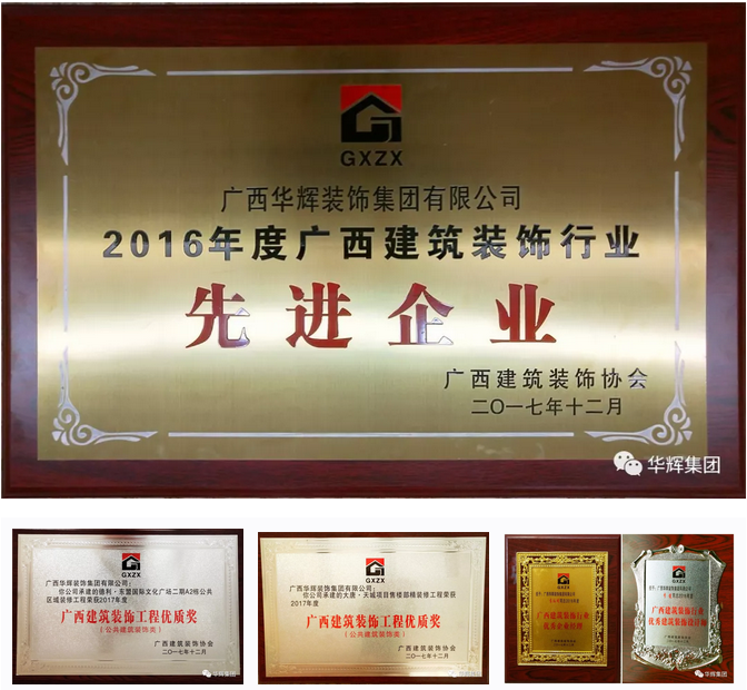 會議上還舉行了隆重的頒獎儀式,華輝裝飾集團(tuán)喜獲多個獎項(xiàng):華輝承建的德利·東盟國際文化廣場裝修工程、大唐·天城項(xiàng)目售樓部裝修工程榮獲2017年度廣西建筑裝飾工程優(yōu)質(zhì)獎(公共建筑裝飾類)”,“2016年度廣西建筑裝飾行業(yè)先進(jìn)企業(yè)”,“2016年度廣西建筑裝飾行業(yè)優(yōu)秀企業(yè)經(jīng)理”及“2016年度廣西建筑裝飾行業(yè)優(yōu)秀建筑裝飾設(shè)計(jì)師”榮譽(yù)稱號。