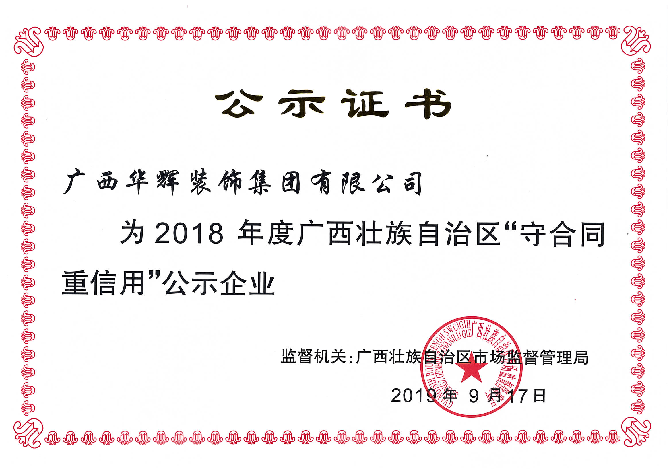 近日,在廣西壯族自治區(qū)市場(chǎng)監(jiān)督管理局開展的“守合同重信用”企業(yè)評(píng)選活動(dòng)中,華輝憑借自身良好的信用體系建設(shè)、誠信守約形象,榮獲2018年度廣西壯族自治區(qū)“守合同重信用”企業(yè)。