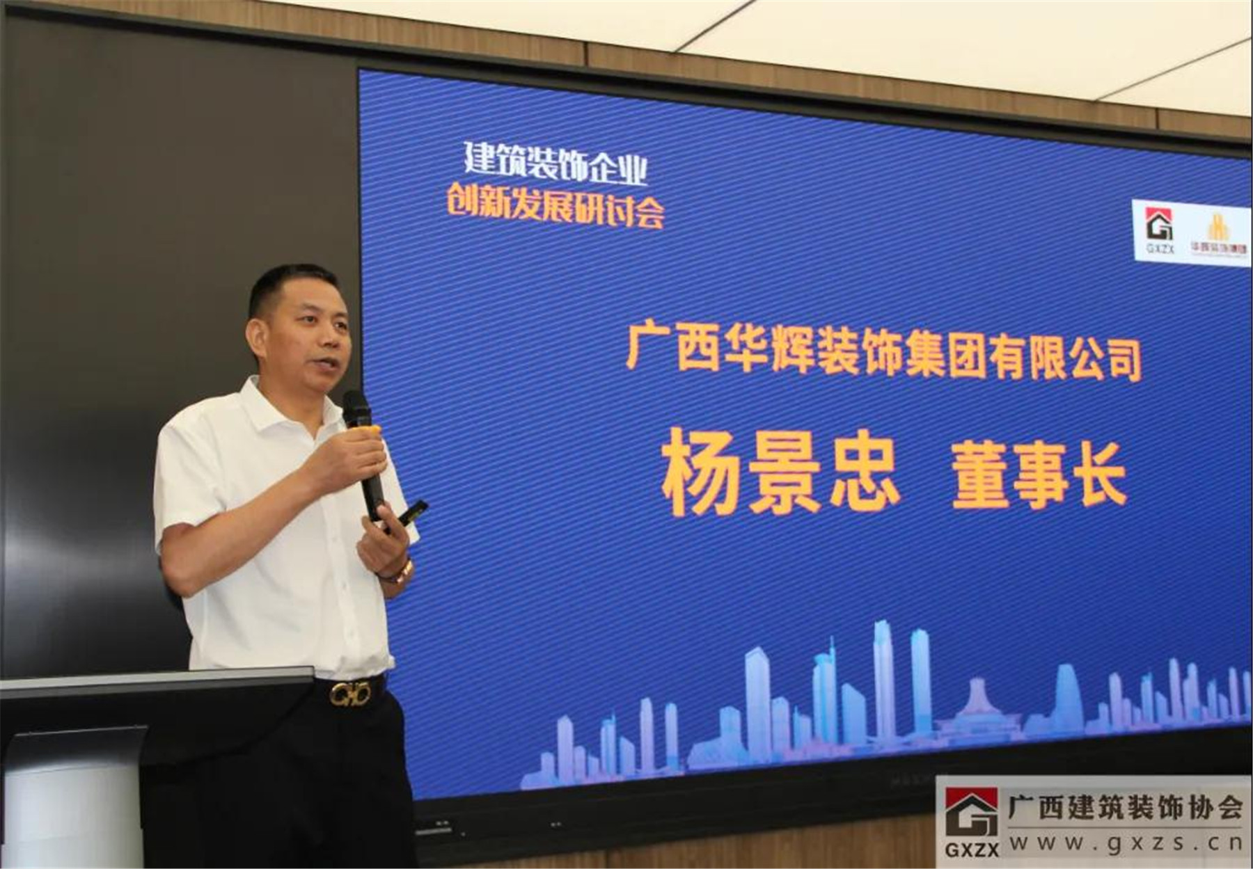 協(xié)會副會長、廣西華輝裝飾集團(tuán)有限公司董事長楊景忠在會上分享了“三駕馬車驅(qū)動華輝轉(zhuǎn)型升級”的重要作用。