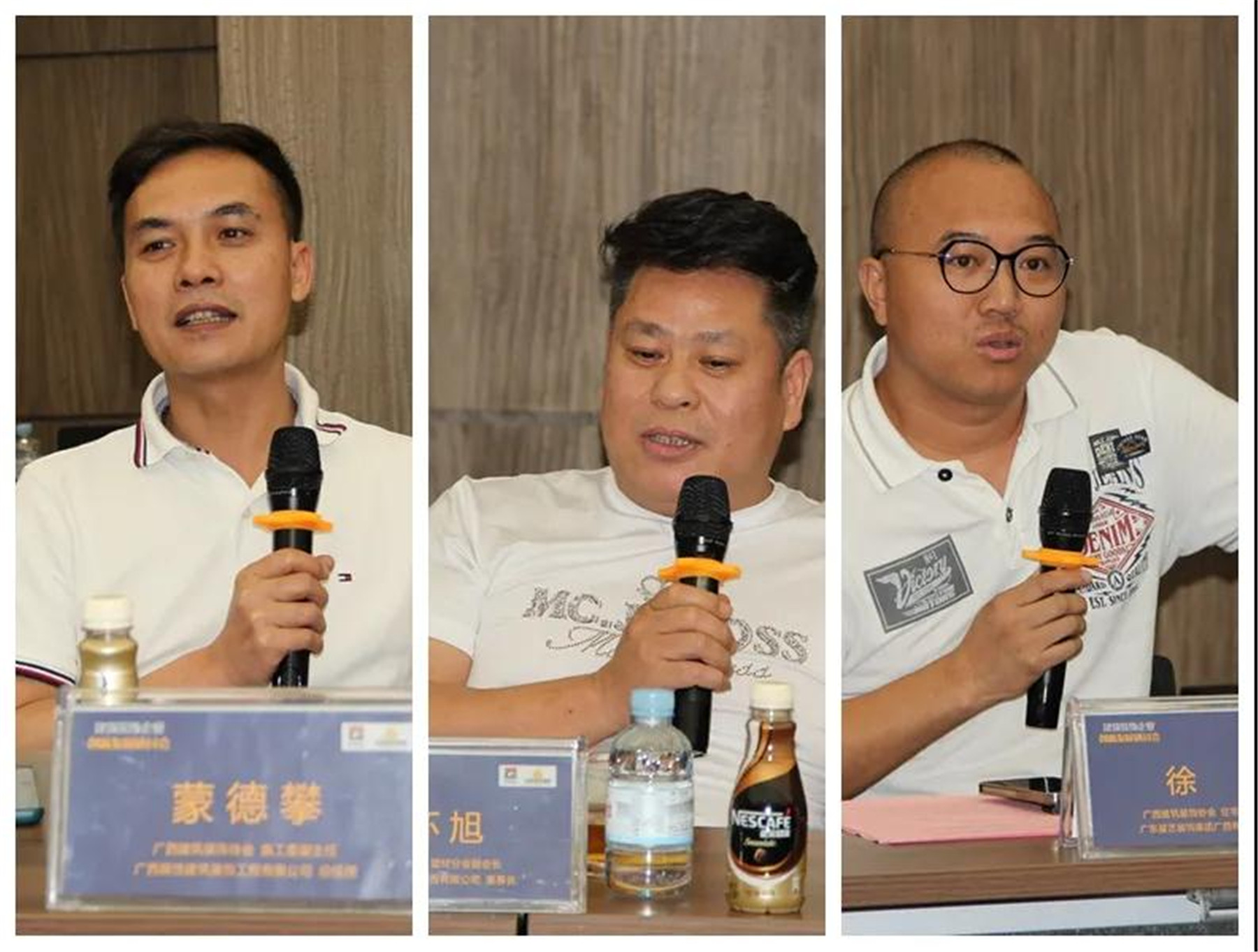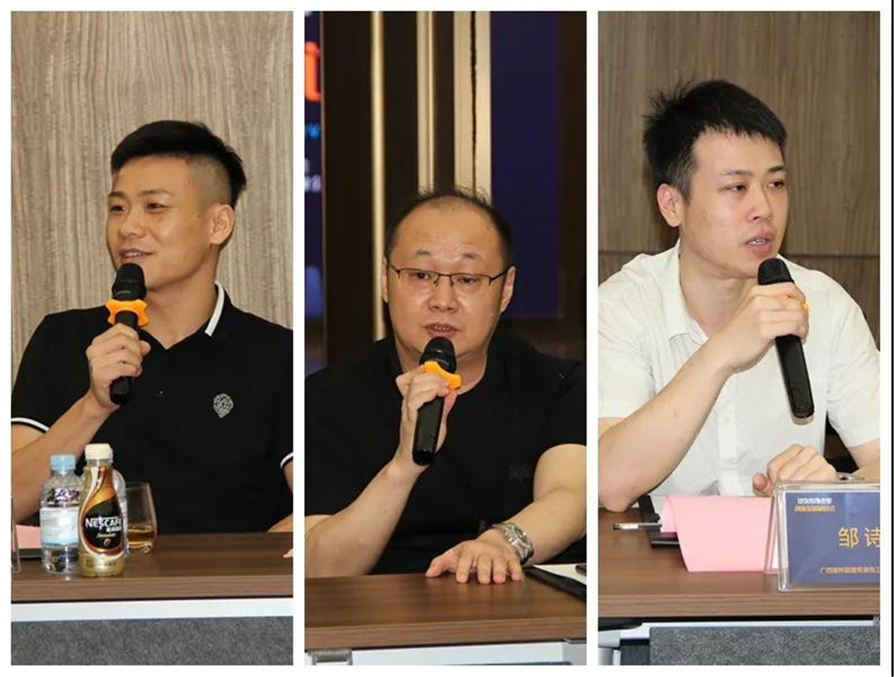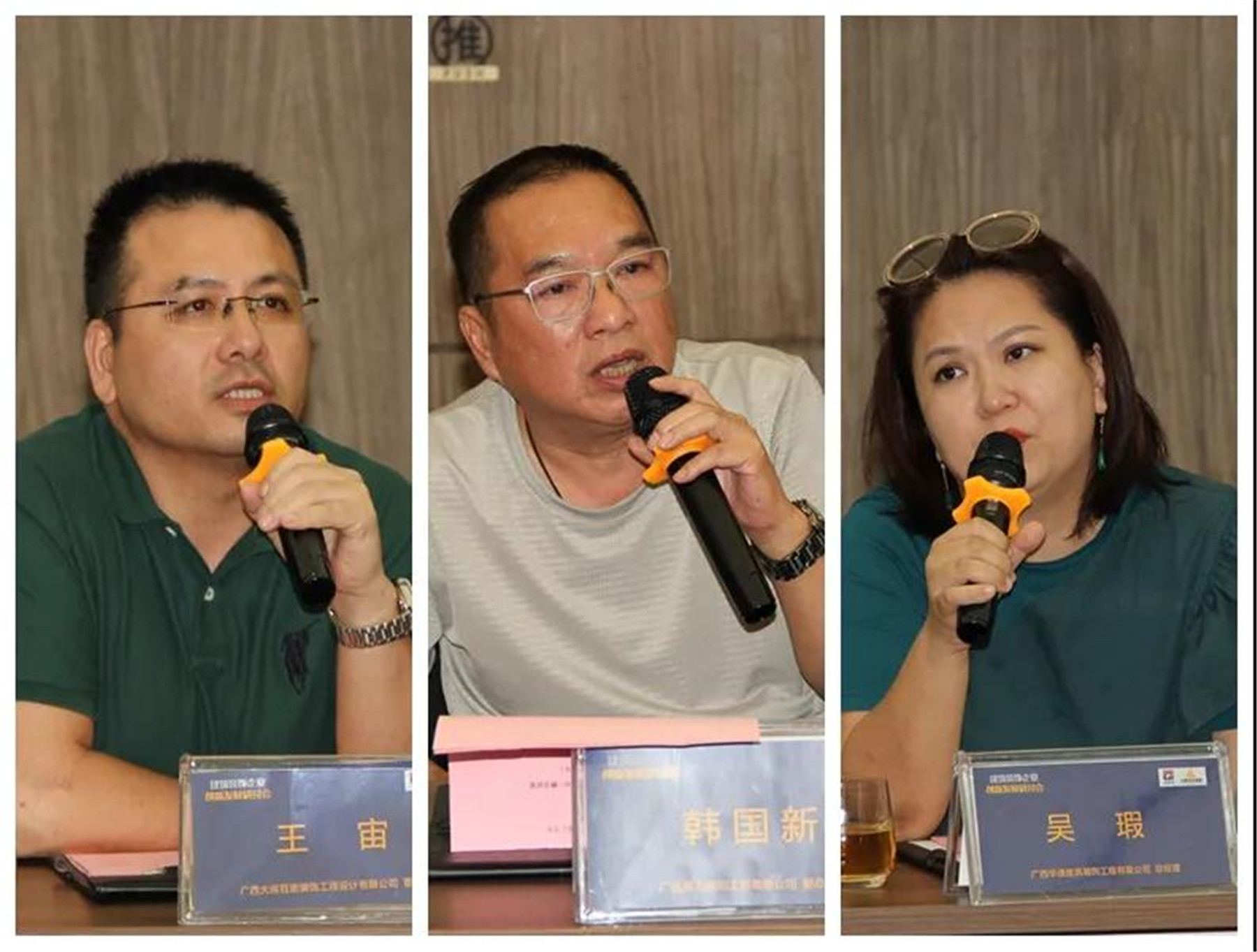 ▲(左)住宅裝修分會副會長、廣西中庭裝飾工程集團(tuán)有限公司董事長 丁胡,(中)廣西渱鈺川裝飾工程有限公司總經(jīng)理 李靈,(右)廣西建科院建筑裝飾工程有限公司總經(jīng)理 鄒詩毅