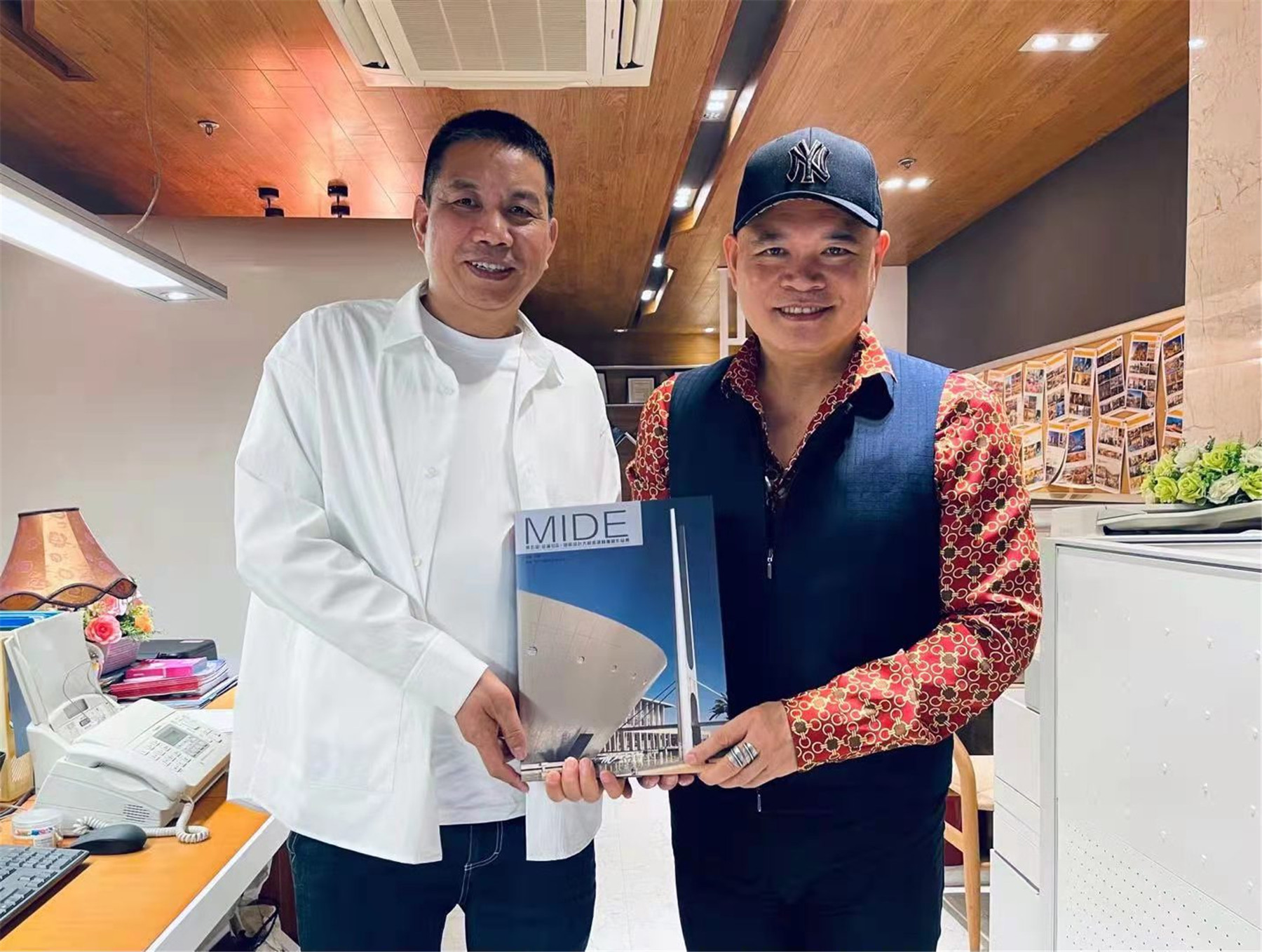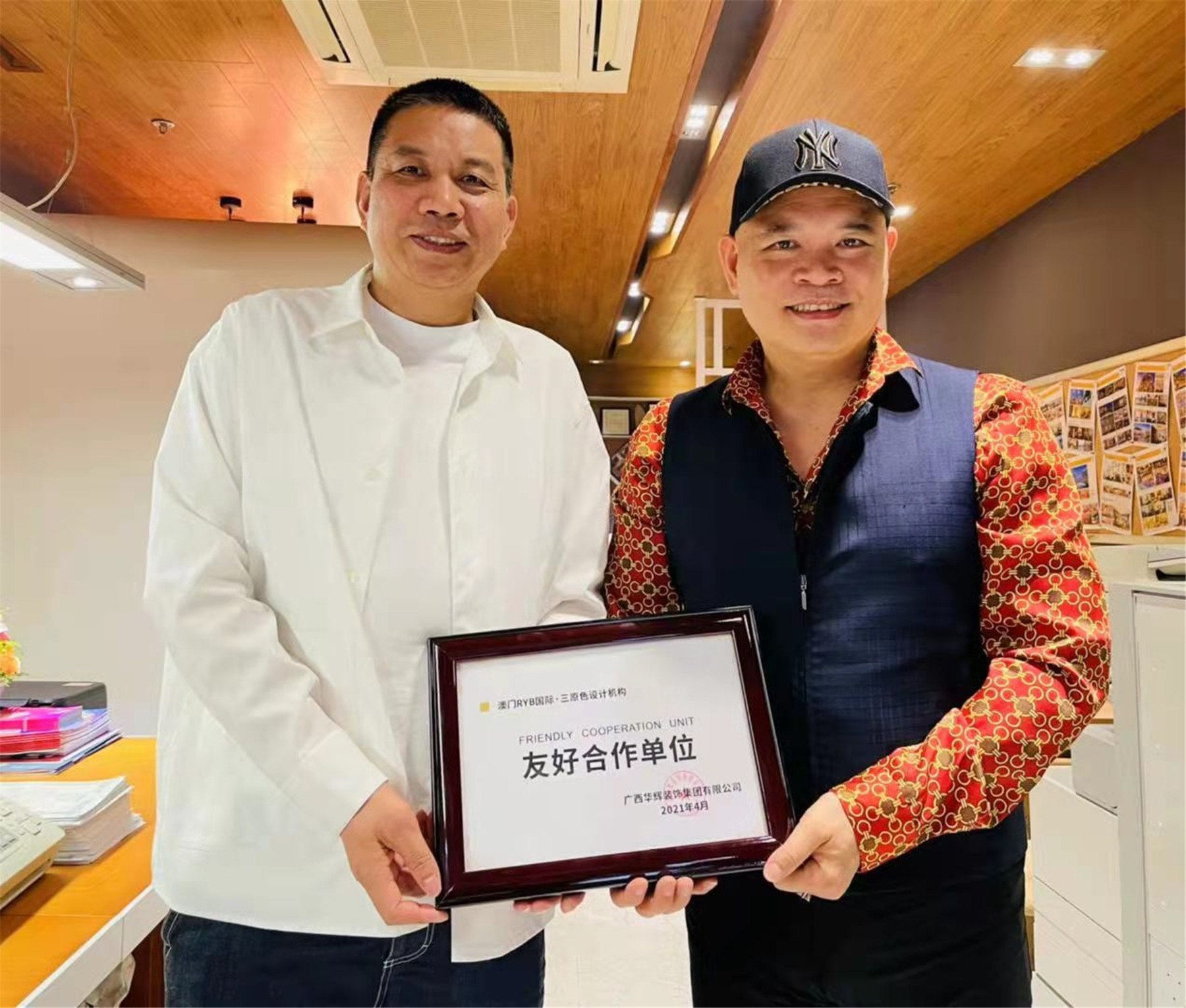 ▲楊景忠董事長與符軍會長互贈“友好合作單位”牌匾及設(shè)計(jì)作品集
