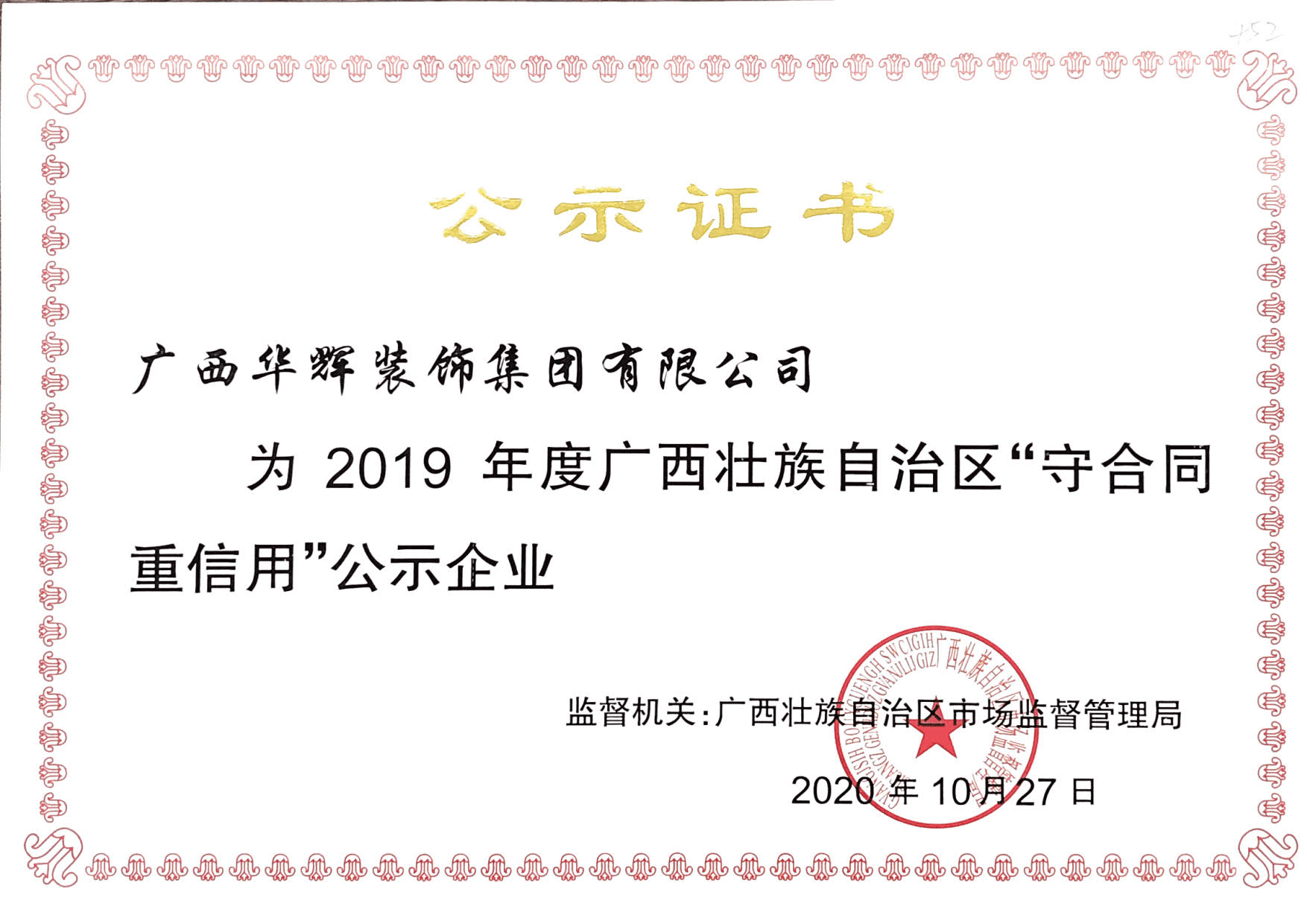 近日,華輝裝飾集團榮獲由廣西市場監(jiān)督管理局頒發(fā)的“2019年度廣西守合同重信用企業(yè)”證書。作為廣西建筑裝飾頭部企業(yè),華輝裝飾集團已連續(xù)多年獲評“廣西守合同重信用企業(yè)”榮譽稱號。