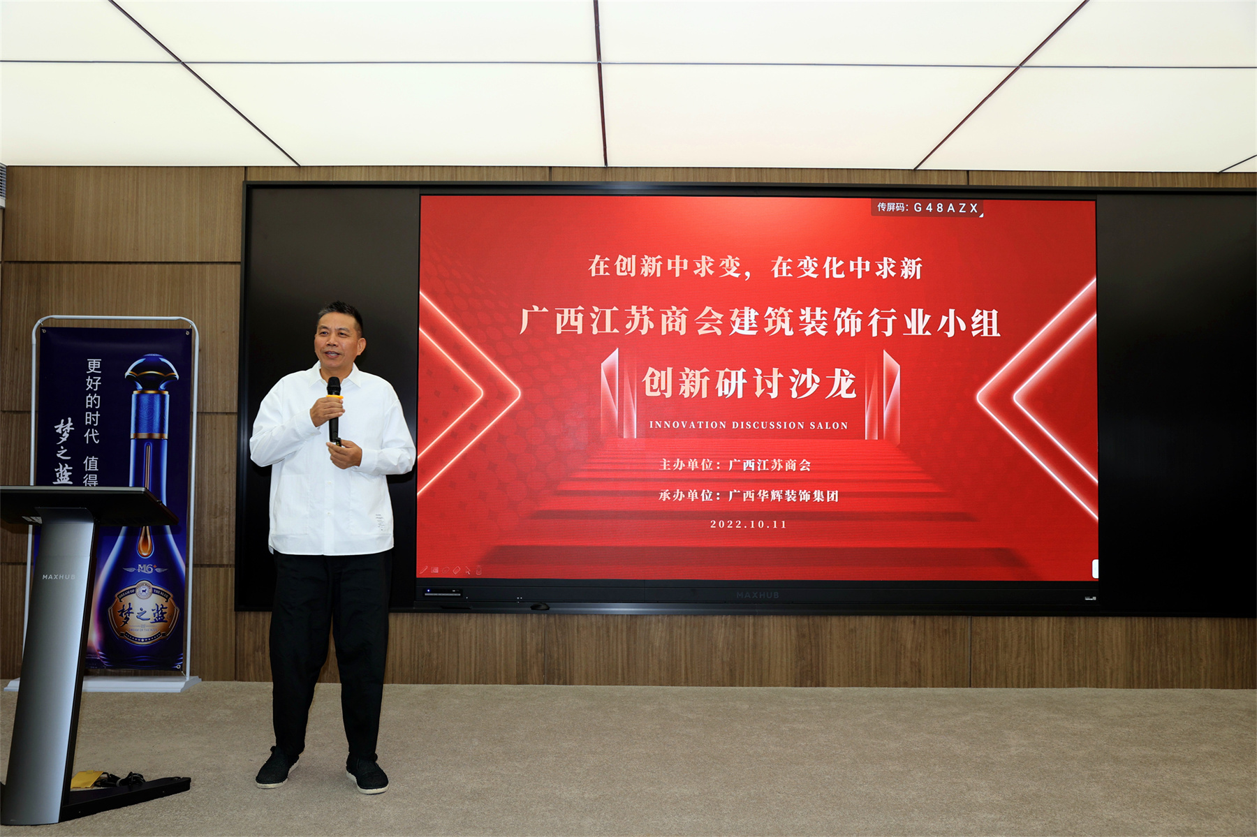 研討會(huì)上,首先由商會(huì)執(zhí)行會(huì)長(zhǎng)、廣西華輝裝飾集團(tuán)董事長(zhǎng)、商會(huì)建筑裝飾行業(yè)小組組長(zhǎng)楊景忠致辭。他說(shuō),在喜迎黨的二十大勝利召開(kāi)之際,我們相聚在華輝裝飾集團(tuán)舉辦沙龍研討會(huì),作為商會(huì)建筑裝飾行業(yè)小組組長(zhǎng),感謝商會(huì)給予華輝承辦此次沙龍研討會(huì)的機(jī)會(huì)。歡迎大家來(lái)到華輝裝飾集團(tuán)。楊景忠指出,我們要共同努力,緊密結(jié)合廣西江蘇商會(huì)的建筑裝飾企業(yè)的發(fā)展特色,聚焦行業(yè)形勢(shì)、難點(diǎn)問(wèn)題、創(chuàng)新熱點(diǎn),共同探討應(yīng)對(duì)之策,廣開(kāi)思路、碰撞思想,搭建一個(gè)相互融通、共建互贏的創(chuàng)新平臺(tái),推動(dòng)企業(yè)持續(xù)健康發(fā)展,開(kāi)創(chuàng)高質(zhì)量發(fā)展新局面,以實(shí)際行動(dòng)迎接黨的二十大勝利召開(kāi)。