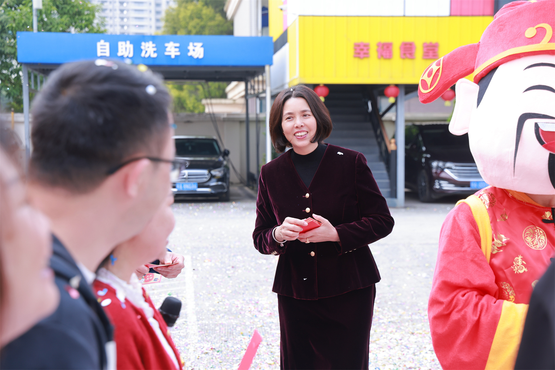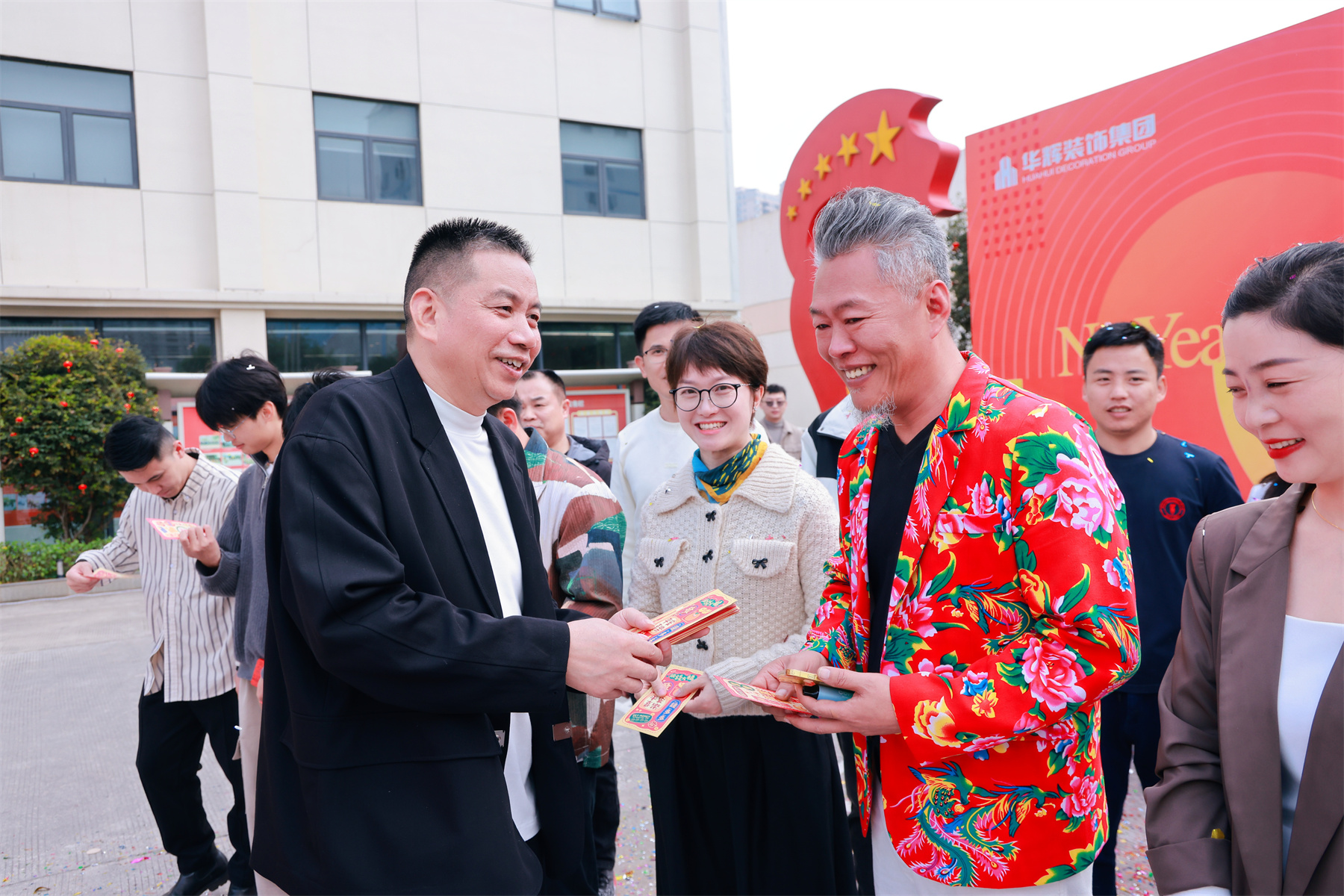集團董事長楊景忠、董事長夫人袁婧惠,攜財神爺一起,為華輝家人們派發(fā)新春紅包,送上開工的第一份祝福與喜悅!